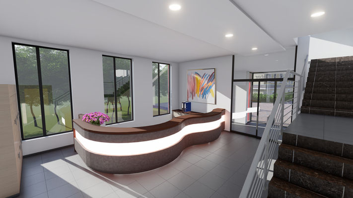 Der Eingangsbereich zeichnet sich aus durch einen runden Tresen, eine wellenförmige Decke und beleuchtete Säulen mit ovalen Durchbrüchen – modern, einladend und skulptural.